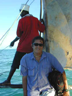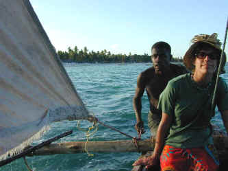 The flunky on the back of the tiny boat steers and helps with the sail. We enjoyed our dhow ride immensely.