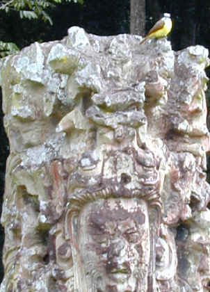 A yellow fly catcher rests on another stelae in the Great Plaza.