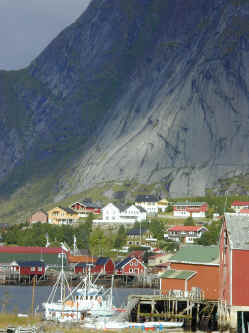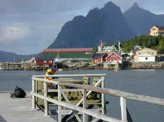 While waiting for a boat trip trough the Reinefjord. we passed the time by buying some food at a grocery store and enjoying a harbor side lunch, together with a game of chess, Here, Rich poses on the dock with the sod covered roofs of rorbu at his back.