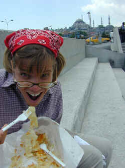 Meanwhile, Kelly digs into some Turkish pastry: feta type cheese wrapped in layer upon layer of a phyllo type dough. Most tasty, cheap and filling.